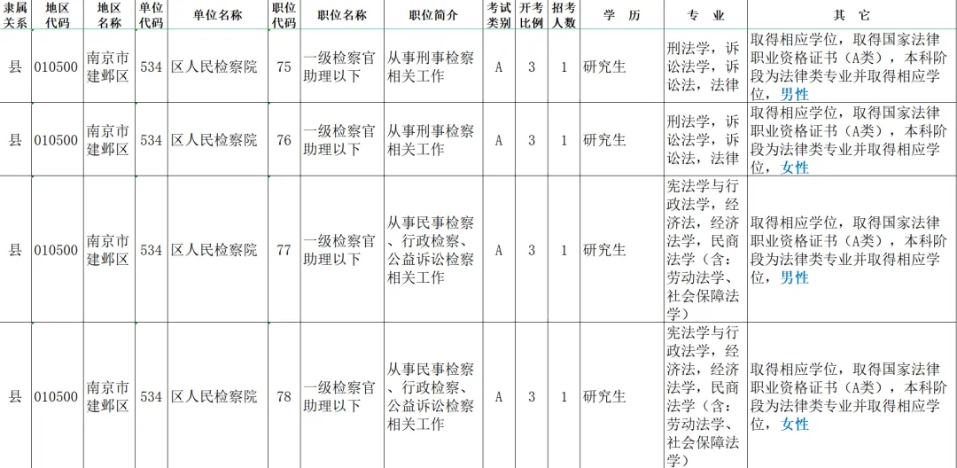 根据江苏省公务员局发布的《江苏省2025年度考试录用公务员公告》,建邺区检察院2025年将考试录用公务员4人。