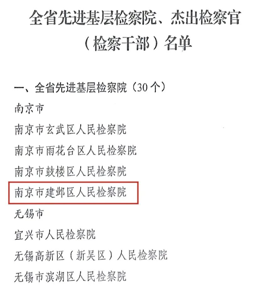 近日,江苏省人力资源和社会保障厅、江苏省人民检察院作出《关于表彰全省先进基层检察院、杰出检察官(检察干部)的决定》,建邺区检察院荣获全省先进基层检察院表彰。