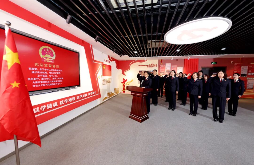 大家面向国旗、国徽,整齐肃立,蒋晓春左手抚按《中华人民共和国宪法》,右手举拳,全体检察官跟随,郑重宣誓。誓言坚定,铿锵有声,激励全体检察官铸牢忠诚之魂、恪守为民初心、练就履职本领、永葆清廉本色。这是全体检察官对国家和人民的庄严承诺,表达了维护宪法权威、维护社会公平正义的坚定决心。